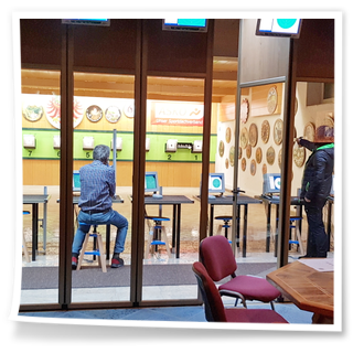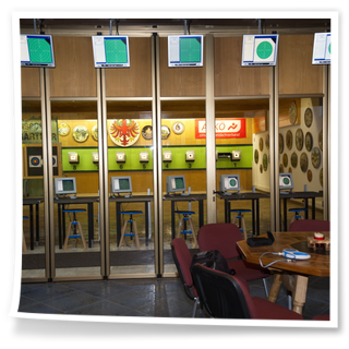 Die einzelnen Schießplätze sind durch eine Glastrennwand vom übrigen Bereich getrennt, damit am Stand Ruhe herrscht.